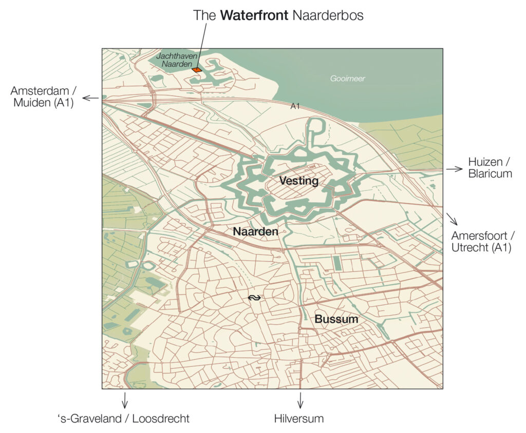 The Waterfront Naarderbos ligt in de gemeente Gooise Meren. Gooise Meren is de jongste gemeente in het Gooi en ontstaan op 1 januari 2016 door de fusie van de gemeenten Bussum, Naarden, Muiden en Muiderberg. Elke kern heeft zijn eigen unieke kwaliteiten, maar gezamenlijk bieden ze een schat aan historie, cultuur, uitgaansgelegenheden en winkelmogelijkheden.